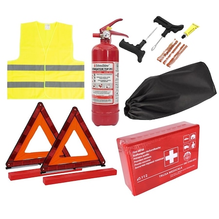 Az autós készlet általában tartalmaz poroltót, elsősegélydobozt, elakadásjelző háromszöget, láthatósági mellényt, tartótáskát és gumitömítés javítót.